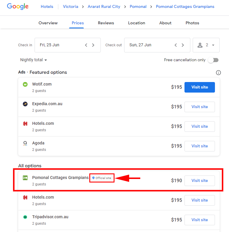 Look for the "Official Site" next to the listing, that is your Free Booking Link that goes to your property website.